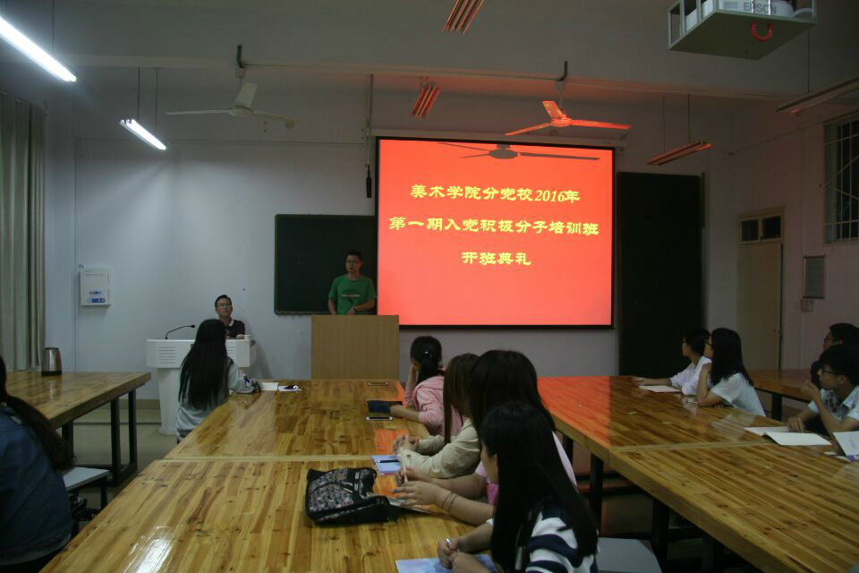 6月1日晚,美术学院分党校2016年第一学期入党积极分子培训班开班典礼在艺术楼308举行。我校学生处教育科科长余伟为美术学院三十二名入党积极分子作了主题为“漫谈大学生的综合能力提升”的演讲,开班典礼由我院辅导员张锐主持。