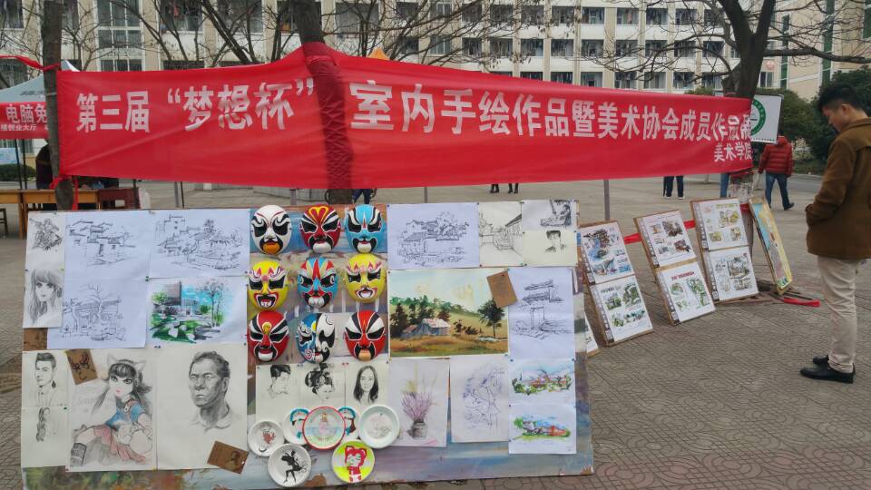 为培养学生的设计创新能力,加强在校学生的专业素养,12月5日由美术学院团总支学生会主办,大学生美术爱好者协会承办的第三届“梦想杯”设计手绘作品展在八餐小广场成功举办。活动现场吸引众多美术爱好者观看展览。