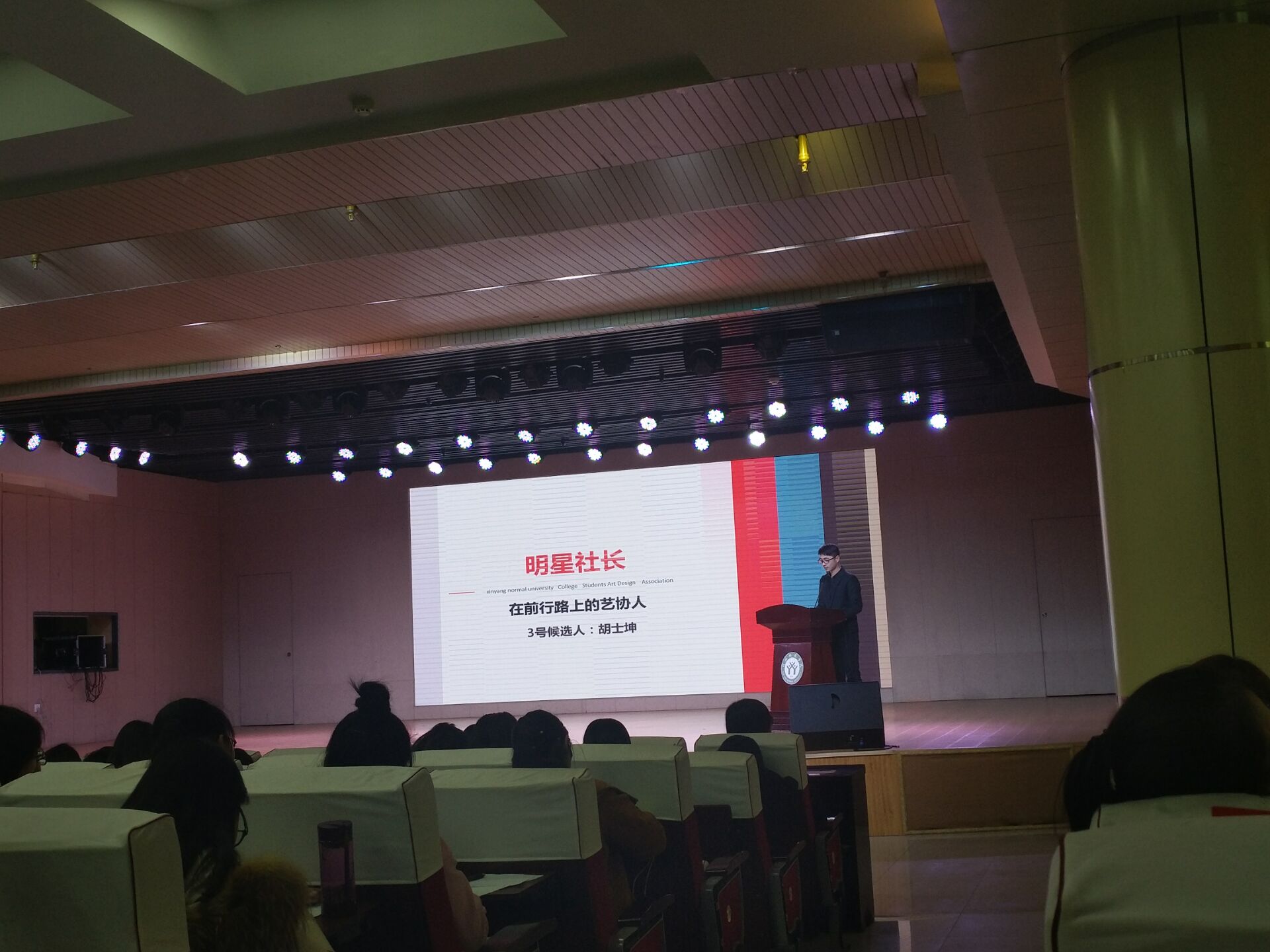 12月8日,由校团委,社团联合会主办的“明星社长”选拔赛在理科楼报告厅成功举办,其中英国365上市公司第十一届大学生艺术设计协会会长胡士坤作为候选人之一参与评选,各院团总支书记,社团指导老师担任评委,现场气氛热烈,座无虚席。
