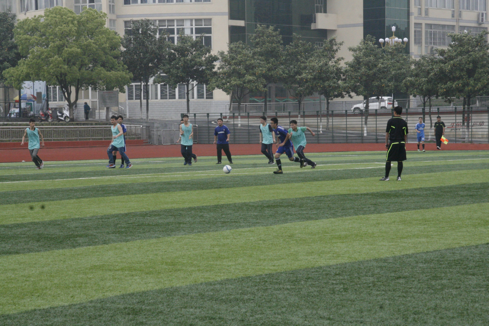 尽管天空中飘着细雨,但这并不能阻挡双方队员的热情。随着裁判的一声哨响,比赛正式开始,我院队员抢得先机,以细腻的脚法,凶猛的进攻,使得计算机学院队员有些被动。双方在进行了将近半个小时的激烈角逐后,美术学院赢得了一次破门。随后,对方展开更加严密的防守和机警的进攻,但在我院队员的齐心协力下,成功突破防线,又进一球。上半场比赛以2:0比分结束。短暂休息后,计算机院对我院展开多次激烈的进攻,并进一球。随后,我院队员积极调整战略,终于寻到对方漏洞,连进3球。最终,我院领先4分,大获全胜。