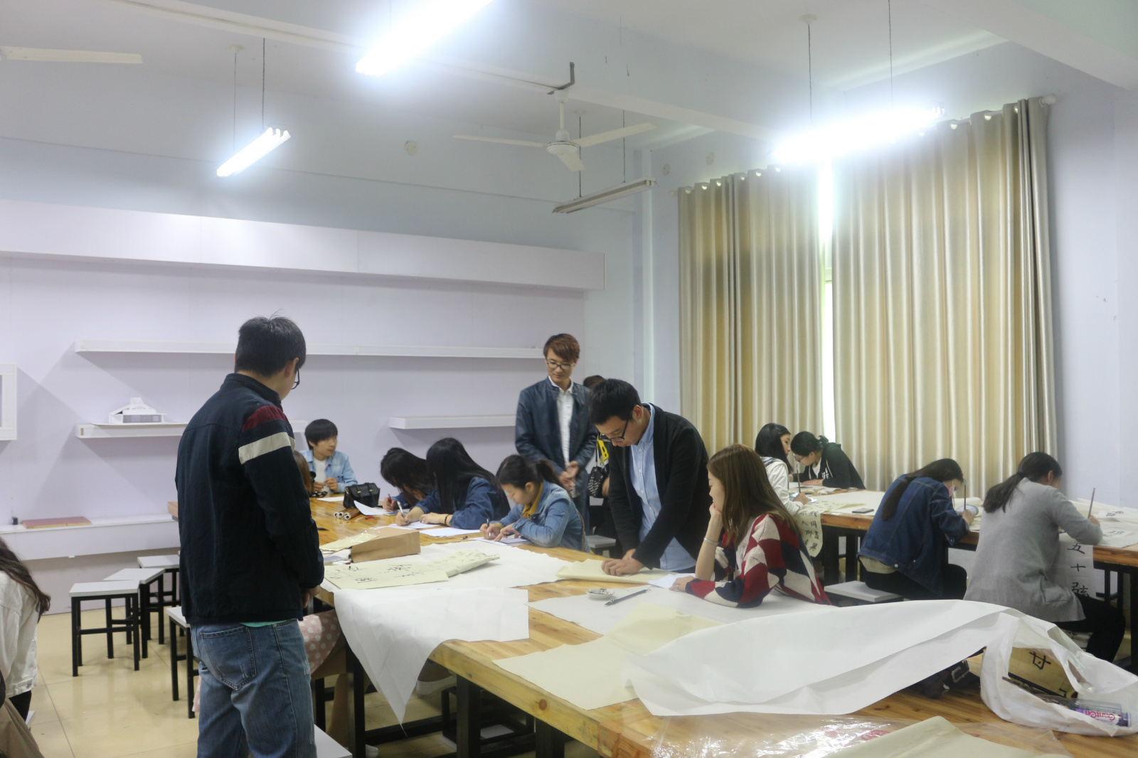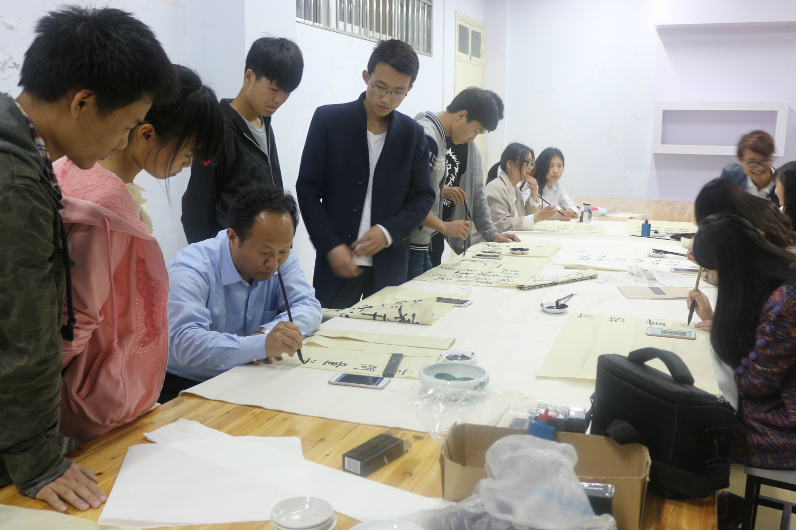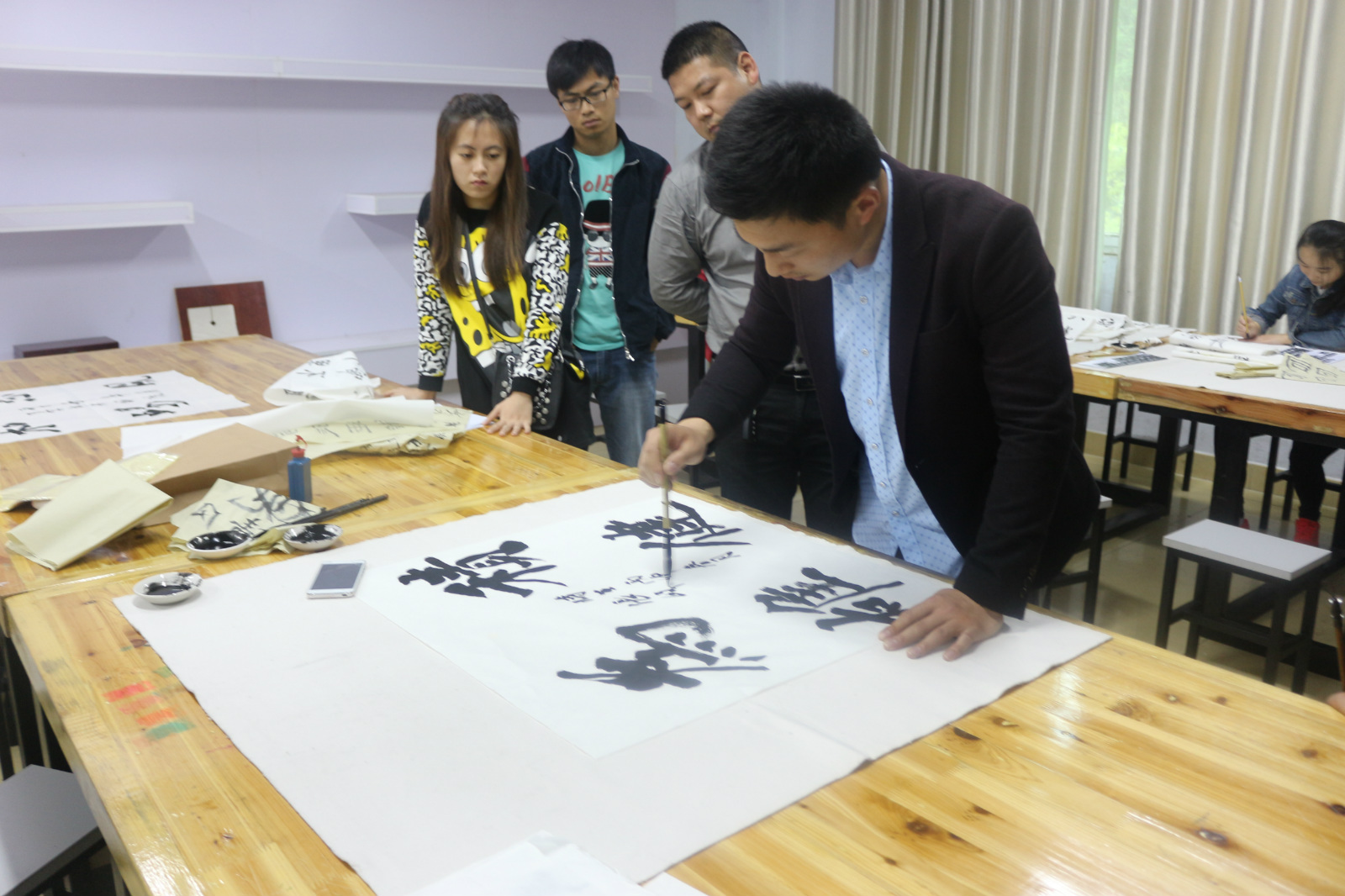 赵明民老师到场进行指导,从拿笔姿势到笔画顺序亲自为同学们示范,教同学们用正确的方式书写。张峰老师也现场展示书法艺术,挥毫笔墨于宣纸间,笔尖舞动跳跃,翩若惊鸿,婉若游龙,令在场同学赞叹不已。