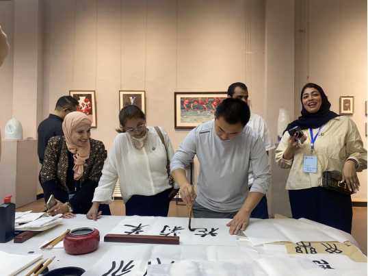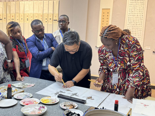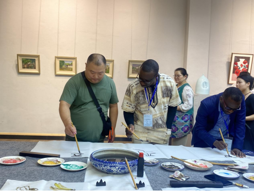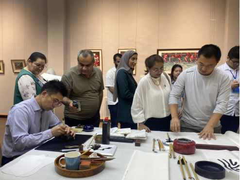 邹东升院长向国际友人们介绍了中国画艺术的传统和造型特点,分享了临制的任伯年《群仙祝寿图》等中国画作品的艺术魅力。学院老师通过现场挥毫泼墨的方式为外国友人展示了中国传统中国画、书法、篆刻艺术的创作方法,指导国际友人学习用笔、用墨、握笔、刻字等技巧,为国际友人题写了中文名字等,鼓励国际友人尝试动手书写、作画,并将作品赠送给他们作为纪念,展示中国的艺术文化。