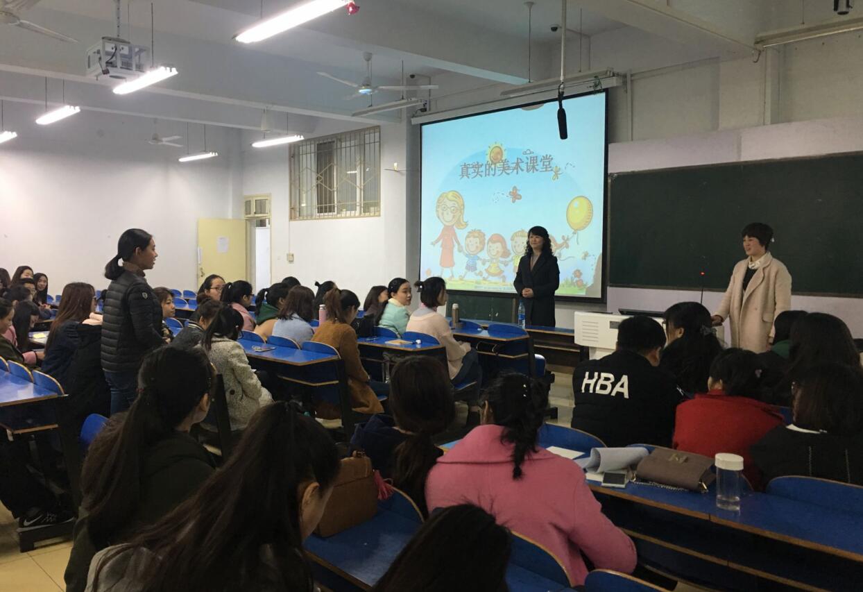 朱艳围绕“我的成长日记”、“招教考试小建议”、“真实的美术课堂”三个方面展开论述。朱艳首先与同学们讲述了自己第一次上课时的窘迫情形,以及自己是如何在校长及其他教师的帮助下解决困难。之后,她以自己曾经担任招教面试官的经历与同学们分享了招教考试的技巧,她强调作为一个老师知识面要广泛,准备笔试和考试时应多关注时事政治,多背多思,熟记教师职业道德规范,并在面试时拿出最好的精神状态,全面展示自身的美术基本功。在“真实的美术课堂”部分,朱艳与同学们分享自己的教学经验,她讲到作为一个老师要注意自己的行为举止,不能用言语刺激学生;在面对学生表示学习任务难度大的问题时,应引导学生从低难度环节开始学习等。在互动环节,朱艳就现场学生提出的问题进行耐心解答,并通过分析自己的教学实例,提出切实中肯的建议,在场学子纷纷表示受益匪浅。
